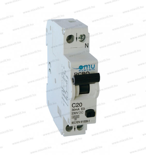 RCBO 2 pólusú 1 modulos 20A C 30mA FI-relé + kismegszakító 4, 5kA