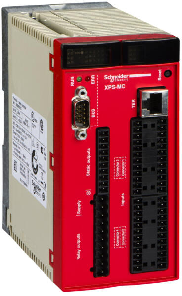 Biztonságtechnikai vezérlő 32bemenettel. termékcsalád: Preventa Biztonság automatizálás - termék vagy komponens típusa: konfigurálható biztonsági vezérlő - biztonsági modul név: XPSMC - biztonsági alkalmazási kategória: legfeljebb 4-es kategória megfelel EN 954-1/EN/ISO 13849-1, PLE maximum megfelel EN/ISO 13849-1, SIL 3 maximum megfelel IEC 61508 - indítás típusa: konfigurálható - szabványok: EN 1760-1/ISO 13856-1, EN 574/ISO 13851, EN 954-1/EN/ISO 13849-1, EN/IEC 60204-1, EN/IEC 60947-5-1, EN/IEC 61496-1, IEC 61508 - termékbizonyítványok: CSA, TÜV, UL - kommunikációs port protokoll: CANopen mellett 1 SUB-D 9-pontos csapos port(ok), soros összeköttetés, átviteli sebesség: 20 kbps, 50 kbps, 125 kbps, 250 kbps, 500 kbps, 800 kbps vagy 1 Mbps, Modbus mellett 1 RJ45 port(ok), soros összeköttetés, átviteli sebesség: 1200 bps, 2400 bps, 4800 bps, 9600 bps or 19200 bps - biztonsági szint: can reach PL e/category 4 megfelel EN 954-1/EN/ISO 13849-1, SIL 3 elérhető megfelel IEC 61508. Előnyök : Nagyobb kapacitás a még nagyobb biztonságért. Egyszerű: a redundancia elvén működő, mikroprocesszoron alapuló technológia fejlett funkciókat biztosít. A rugalmasság a biztonsági funkció választásakor és a még pontosabb diagnosztika csak példa a számos előnyre, amelyet a gépgyártók és a felhasználók kihasználhatnak az innovatív megoldások integrálásával... Alkalmazások: - A kezelő és a gép védelmét igénylő minden potenciálisan veszélyes gép...