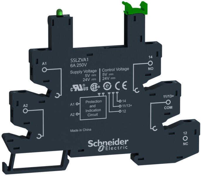 Ez a relé foglalat a 12 VDC vezérlőfeszültségű Zelio SSL interfész szilárdtestrelékkel kompatibilis. Rendkívül keskeny kialakítású, mindössze 6,2 mm szélességű foglalat, a be- és kimenő vezetékek rugós sorkapocsba köthetők. A foglalat oldalán látható áramkör jelzések és rajzok megkönnyítik a telepítést és a karbantartást, a LED állapotjelző pedig segít a működési állapot beazonosításában.