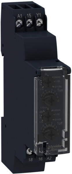 Ez a Zelio RE17R időrelé 0,1 másodperc és 100 óra közötti időtartományban állítható, kimeneti maximális áramerőssége 8 A, 17,5 mm széles, és 12 V AC/DC tápellátással működtethető. 1 db SPDT (egypólusú, kétállású) átkapcsoló érintkező is tartozik hozzá. A piacon elérhető egyik legvékonyabb készülék, amely rugalmasan és egyszerűen szerelhető DIN sínre, miközben ugyanannyi helyet foglal el, mint bármelyik moduláris egypólusú DIN eszköz. Lezárható burkolattal kapható, forgatható finomhangolóval egyszerűen és pontosan beállítható. Az egyfunkciós időzítő könnyen beilleszthető huzalozott logikájú rendszerekbe: ideális megoldás berendezések és egyszerű automatizálási rendszerek PLC nélküli vezérlésére.