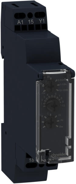 Ez a Zelio RE17R időrelé 0,1 másodperc és 100 óra közötti időtartományban állítható, kimeneti maximális áramerőssége 8 A, 17,5 mm széles, és 12 V AC/DC tápellátással működtethető. 1 db SPDT (egypólusú, kétállású) átkapcsoló érintkező is tartozik hozzá. A piacon elérhető egyik legvékonyabb készülék, amely rugalmasan és egyszerűen szerelhető DIN sínre, miközben ugyanannyi helyet foglal el, mint bármelyik moduláris egypólusú DIN eszköz. Lezárható burkolattal kapható, forgatható finomhangolóval egyszerűen és pontosan beállítható. A multifunkciós időzítő könnyen beilleszthető huzalozott logikájú rendszerekbe: ideális megoldás berendezések és egyszerű automatizálási rendszerek PLC nélküli vezérlésére.