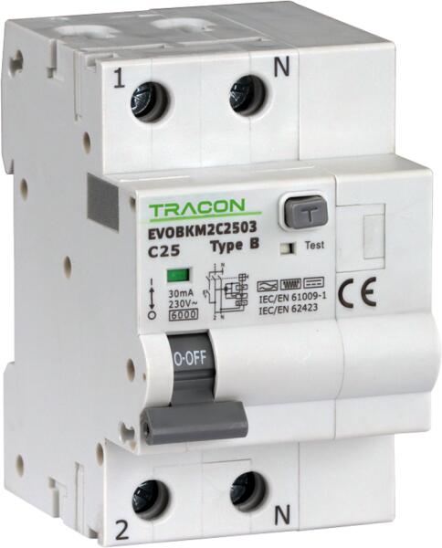 TRACON Kombinált védőkapcsoló, 2P, 3modul, C karakterisztika, C25A, 30 mA, 6kA, B (EVOBKM2C2503) (EVOBKM2C2503)
